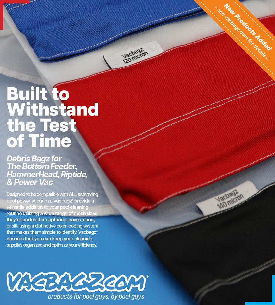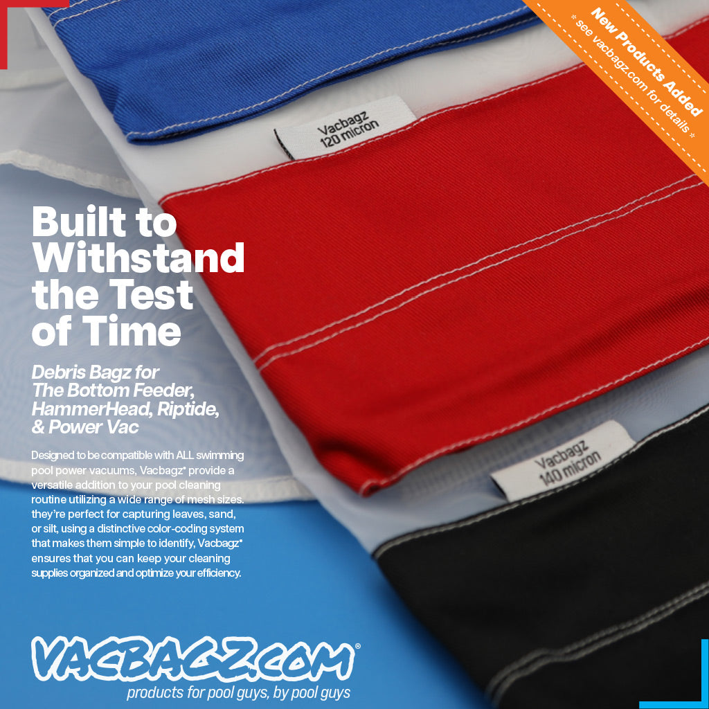 Introducing the Vacbagz® Pool Vacuum Debris Bag – the ultimate solution for a crystal-clear pool! Cleaning your pool has never been easier with these reliable and efficient mesh bagz. Designed to be compatible with all major swimming pool power vacuums, you’ll have no trouble using and identifying these bagz based on our distinctive, easy to use color-coding system.