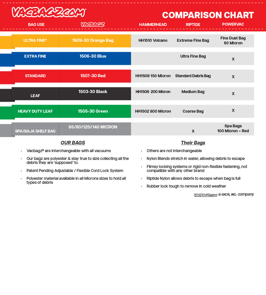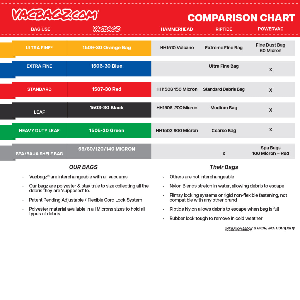 A side-by-side breakdown of our different debris bags compared to the competition to help choose the right vacuum bag based on micron size, debris type, and durability to simplify the selection process ensuring you get the right bag for your specific pool cleaning needs.